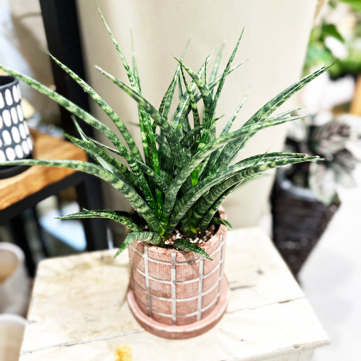- 玄関のちょっとしたスペースやシューズボックスの上などに置くのに最適です。場所を取らず、さりげなく緑を添えられます。複数の小型サンスベリアを並べて飾るのもおすすめです。